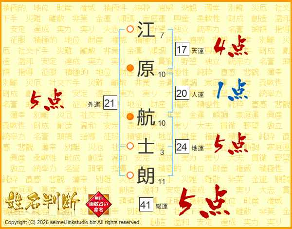 江(7画)原(10画) 航(10画)士(3画)朗(11画)