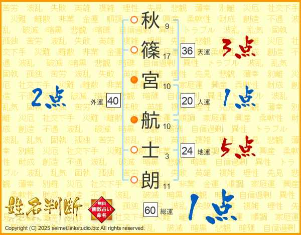 秋(9画)篠(17画)宮(10画) 航(10画)士(3画)朗(11画)