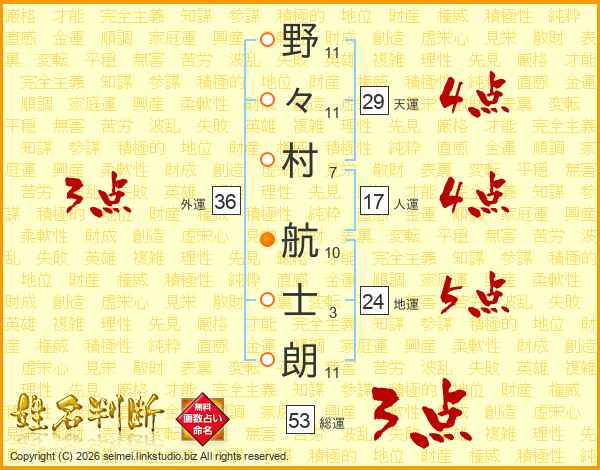 野(11画)々(11画)村(7画) 航(10画)士(3画)朗(11画)