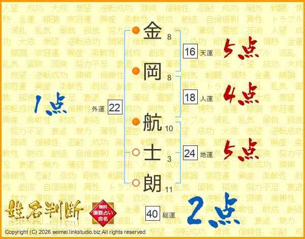 金(8画)岡(8画) 航(10画)士(3画)朗(11画)