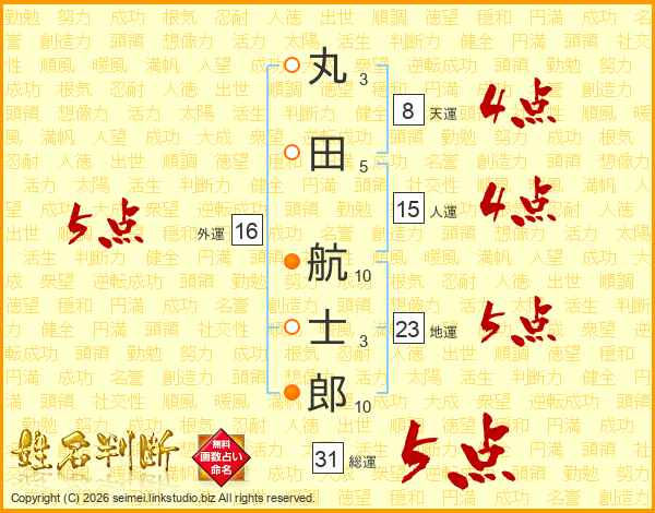 丸(3画)田(5画) 航(10画)士(3画)郎(10画)