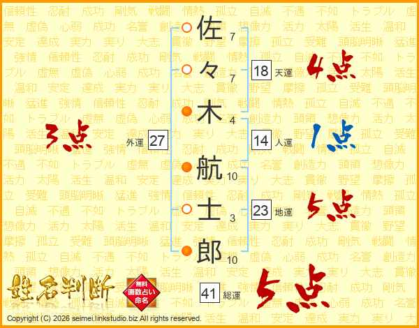 佐々木航士郎さんの総運は41画の5点!