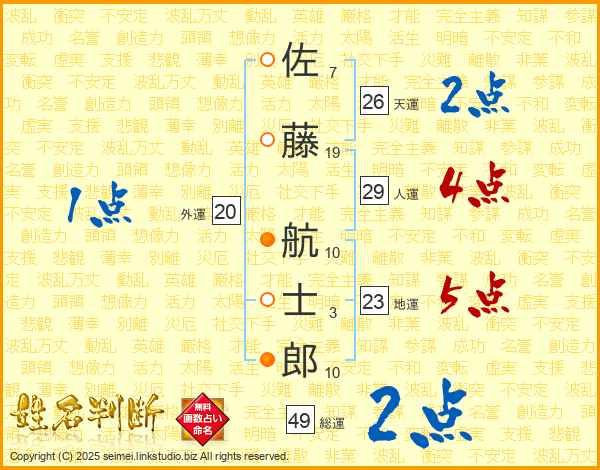 佐(7画)藤(19画) 航(10画)士(3画)郎(10画)
