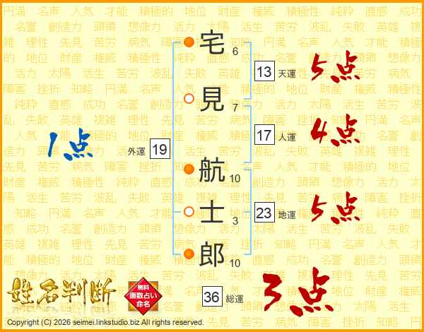 宅(6画)見(7画) 航(10画)士(3画)郎(10画)