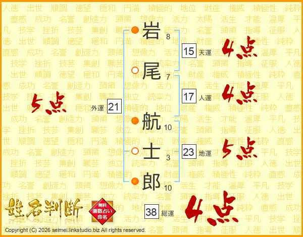 岩(8画)尾(7画) 航(10画)士(3画)郎(10画)