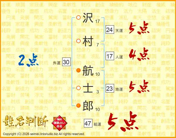 沢(17画)村(7画) 航(10画)士(3画)郎(10画)