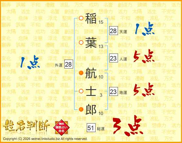 稲(15画)葉(13画) 航(10画)士(3画)郎(10画)