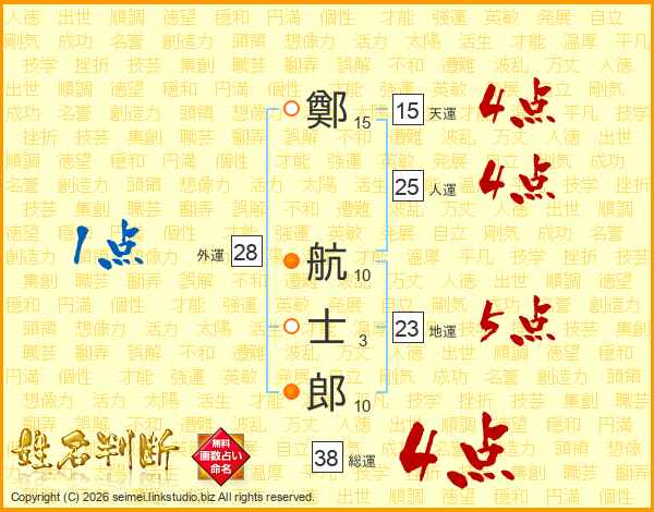 鄭(15画) 航(10画)士(3画)郎(10画)