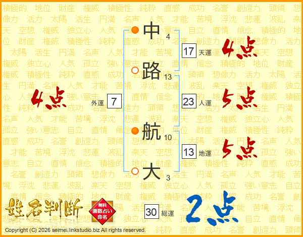 あなたの人生を表す1番重要な運勢です。生涯を通じて影響する総合運となり、主に50歳以降の晩年期に影響を及ぼします。苗字と名前の合計画数。