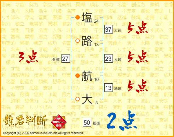 生活面を象徴する運勢です。外部から受ける影響力を表し、結婚運、家庭運や職場、環境への順応性を表します。総運から人運を引いた画数。姓や名が1文字の場合を除く。
