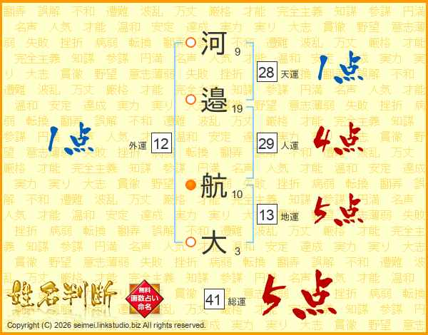 生活面を象徴する運勢です。外部から受ける影響力を表し、結婚運、家庭運や職場、環境への順応性を表します。総運から人運を引いた画数。姓や名が1文字の場合を除く。
