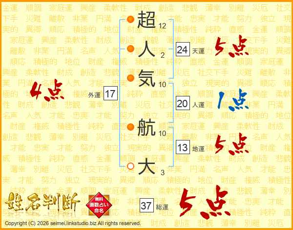 超人気航大さんの天運は24画の5点!