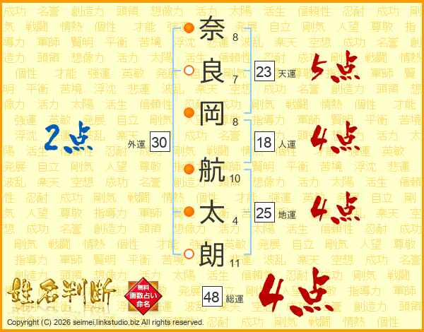 奈(8画)良(7画)岡(8画) 航(10画)太(4画)朗(11画)