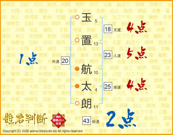 玉(5画)置(13画) 航(10画)太(4画)朗(11画)