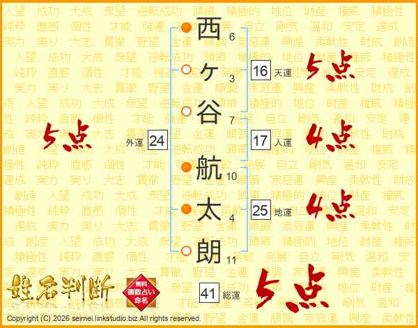 西(6画)ヶ(3画)谷(7画) 航(10画)太(4画)朗(11画)