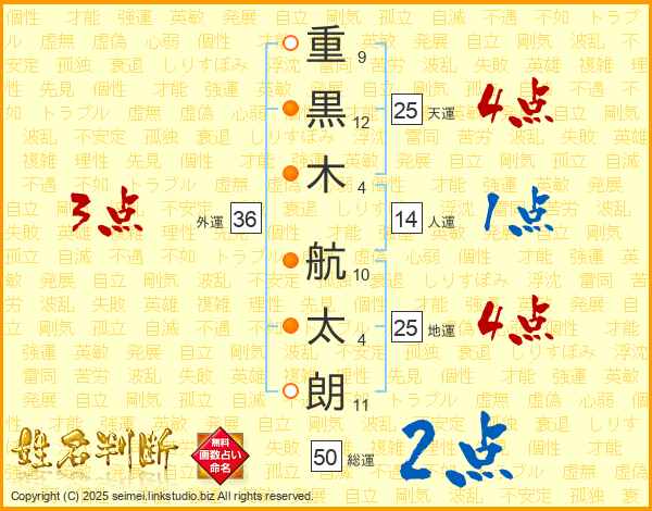 重(9画)黒(12画)木(4画) 航(10画)太(4画)朗(11画)