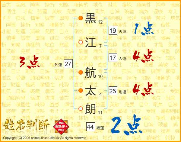 黒(12画)江(7画) 航(10画)太(4画)朗(11画)