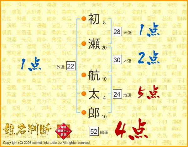 初(8画)瀬(20画) 航(10画)太(4画)郎(10画)