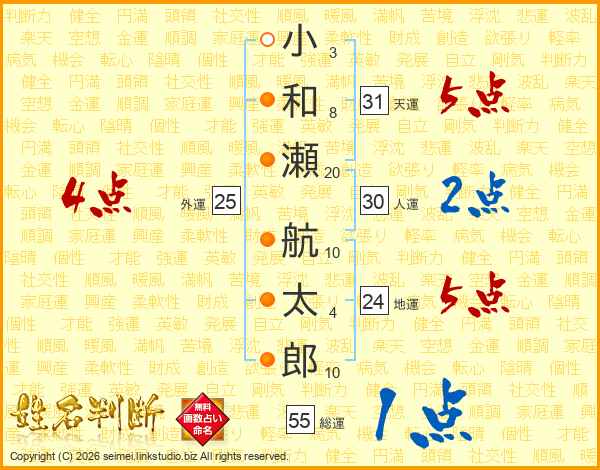 小(3画)和(8画)瀬(20画) 航(10画)太(4画)郎(10画)