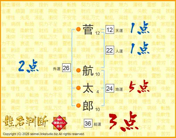 あなたの人生を表す1番重要な運勢です。生涯を通じて影響する総合運となり、主に50歳以降の晩年期に影響を及ぼします。苗字と名前の合計画数。