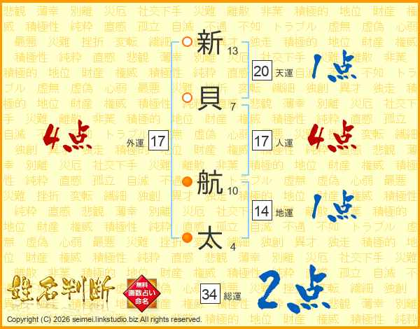 新貝航太さんの地運は14画の1点!