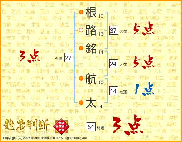 根(10画)路(13画)銘(14画) 航(10画)太(4画)
