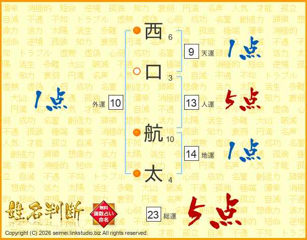 生活面を象徴する運勢です。外部から受ける影響力を表し、結婚運、家庭運や職場、環境への順応性を表します。総運から人運を引いた画数。姓や名が1文字の場合を除く。