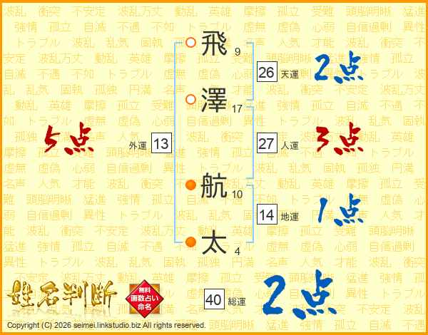 生活面を象徴する運勢です。外部から受ける影響力を表し、結婚運、家庭運や職場、環境への順応性を表します。総運から人運を引いた画数。姓や名が1文字の場合を除く。