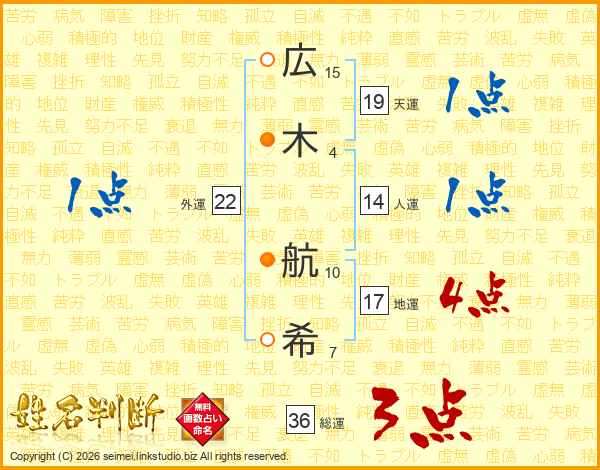 広(15画)木(4画) 航(10画)希(7画)