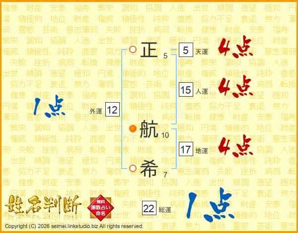 生活面を象徴する運勢です。外部から受ける影響力を表し、結婚運、家庭運や職場、環境への順応性を表します。総運から人運を引いた画数。姓や名が1文字の場合を除く。