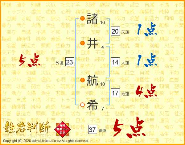 諸(16画)井(4画) 航(10画)希(7画)