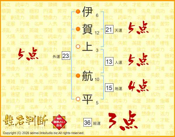 伊(6画)賀(12画)上(3画) 航(10画)平(5画)