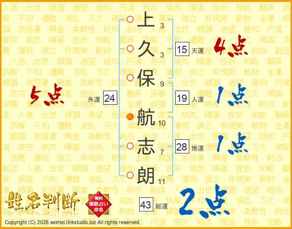 上(3画)久(3画)保(9画) 航(10画)志(7画)朗(11画)