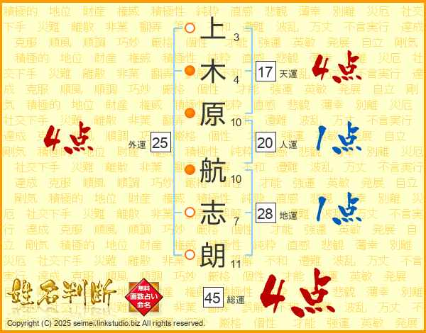 上(3画)木(4画)原(10画) 航(10画)志(7画)朗(11画)