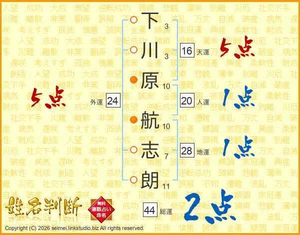 下(3画)川(3画)原(10画) 航(10画)志(7画)朗(11画)