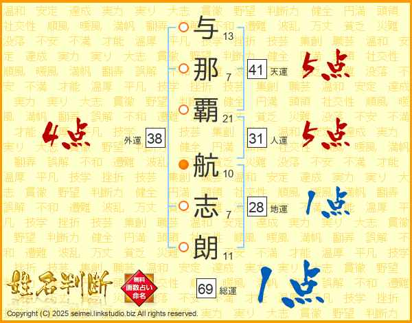与(13画)那(7画)覇(21画) 航(10画)志(7画)朗(11画)