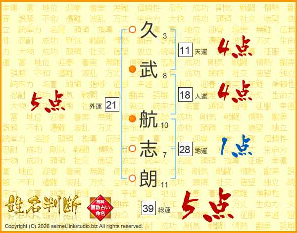久(3画)武(8画) 航(10画)志(7画)朗(11画)