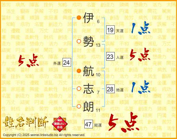 伊勢航志朗さんの総運は47画の5点!