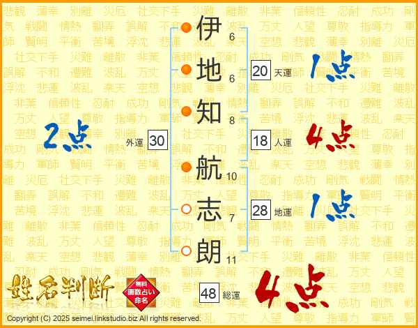 伊(6画)地(6画)知(8画) 航(10画)志(7画)朗(11画)
