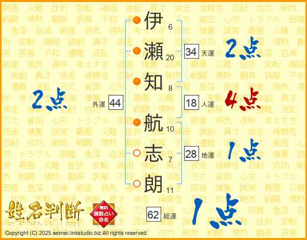 伊瀬知航志朗さんの天運は34画の2点!