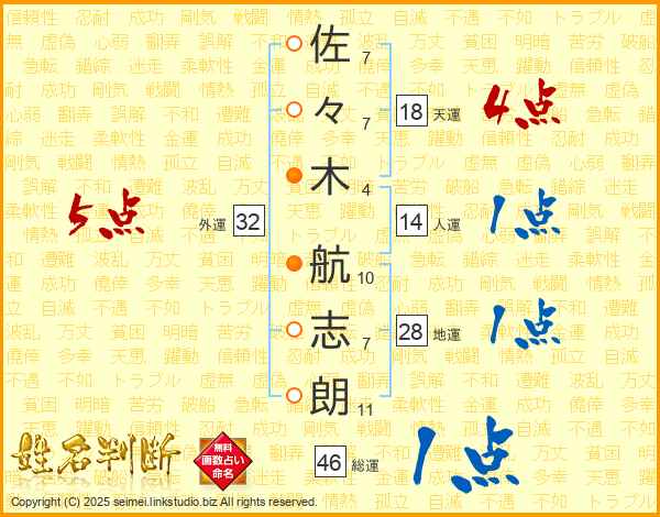 佐(7画)々(7画)木(4画) 航(10画)志(7画)朗(11画)