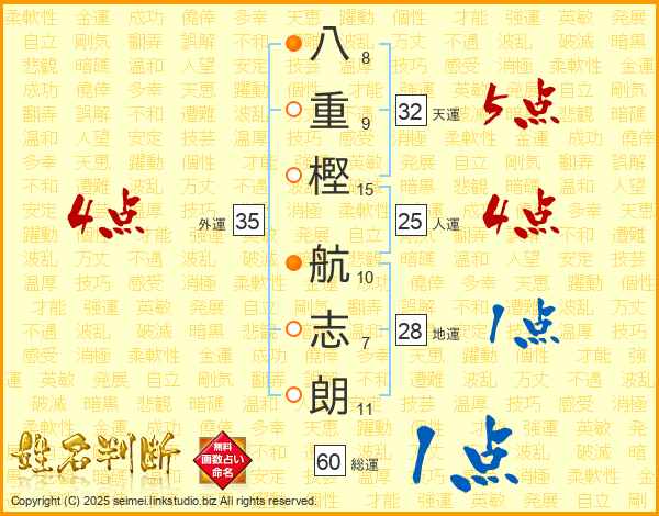 八(8画)重(9画)樫(15画) 航(10画)志(7画)朗(11画)