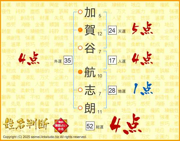 加(5画)賀(12画)谷(7画) 航(10画)志(7画)朗(11画)