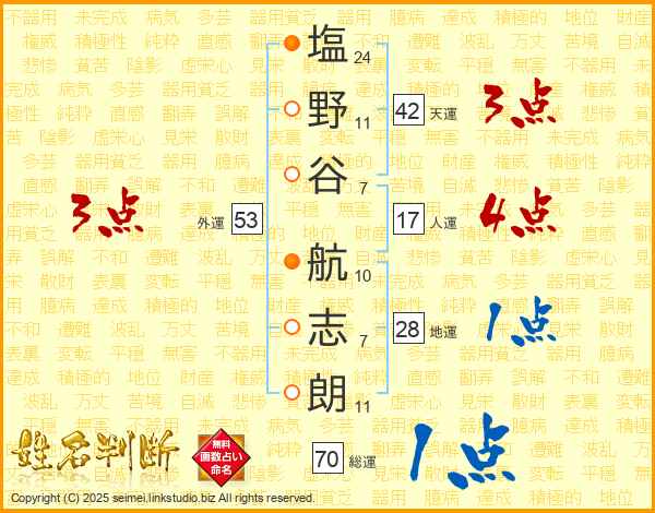 塩(24画)野(11画)谷(7画) 航(10画)志(7画)朗(11画)