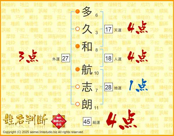 多(6画)久(3画)和(8画) 航(10画)志(7画)朗(11画)
