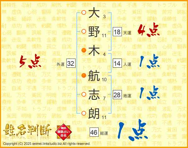 大(3画)野(11画)木(4画) 航(10画)志(7画)朗(11画)