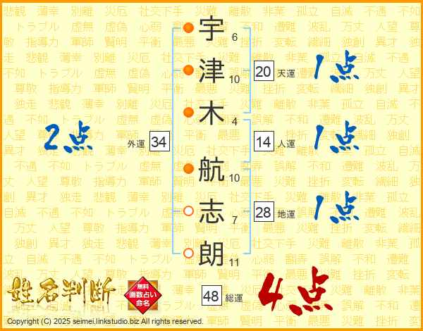 宇(6画)津(10画)木(4画) 航(10画)志(7画)朗(11画)