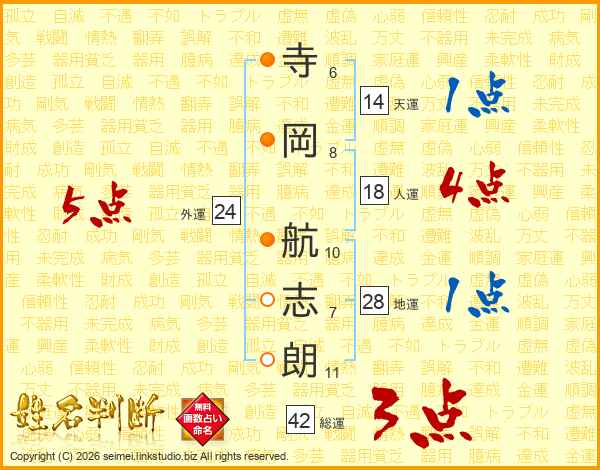寺(6画)岡(8画) 航(10画)志(7画)朗(11画)