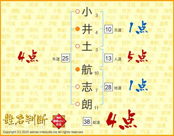 小(3画)井(4画)土(3画) 航(10画)志(7画)朗(11画)