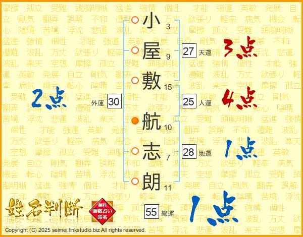小(3画)屋(9画)敷(15画) 航(10画)志(7画)朗(11画)